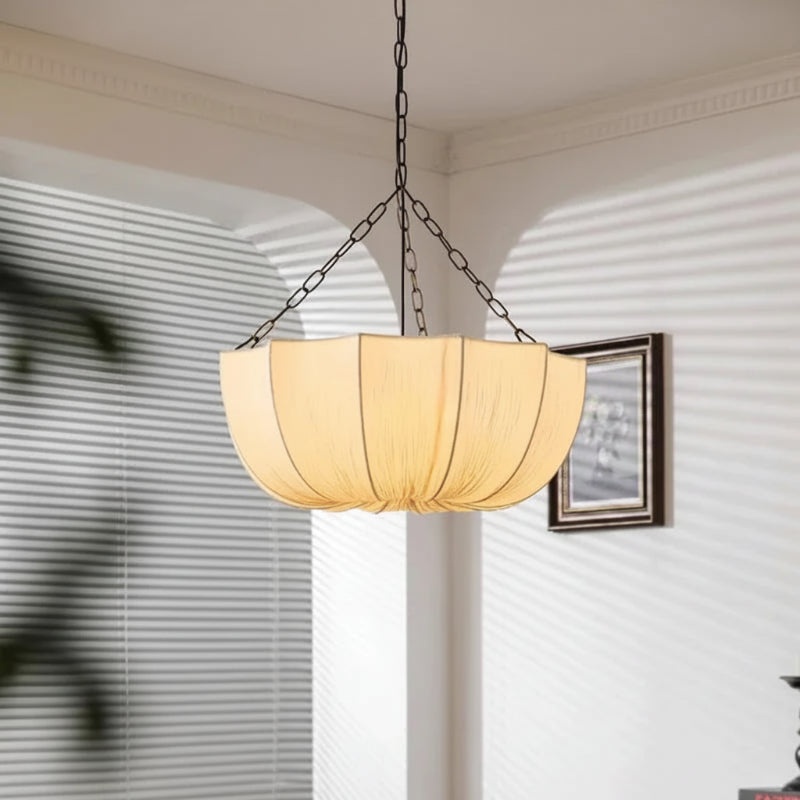 The Hand Ruched Cloth Pendant blends European-inspired craftsmanship with a touch of refinement. Hand-assembled with a blackened metal chain and its softly ruched cloth shade, it balances structured strength with delicate texture. Designed to age beautifully, it brings warmth, character, and timeless elegance to any space.