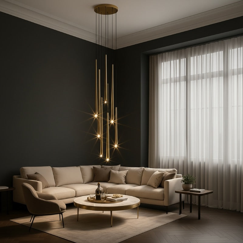 This striking Slim Multi Pendant adds some interest and depth to your space. With a polished brass finish and crystal light heads for crisp and clear light, this pendant light is an art piece with functionality, making it a beautiful addition to your contemporary home or office.